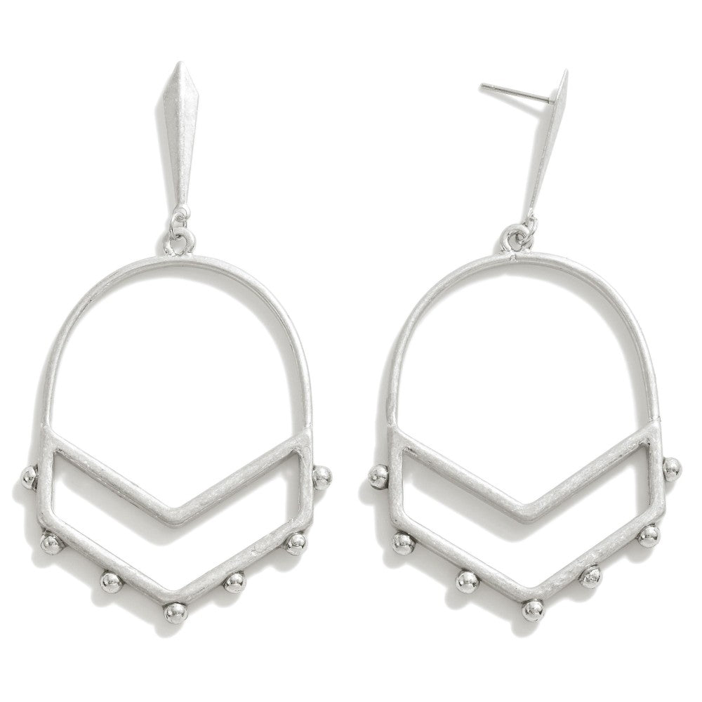 Elevate your style with our Chevron Detail Drop earrings. Featuring chic chevron and studded detailing, these lightweight earrings are perfect for adding a touch of sophistication to any outfit. Upgrade your jewelry collection with this must-have accessory.