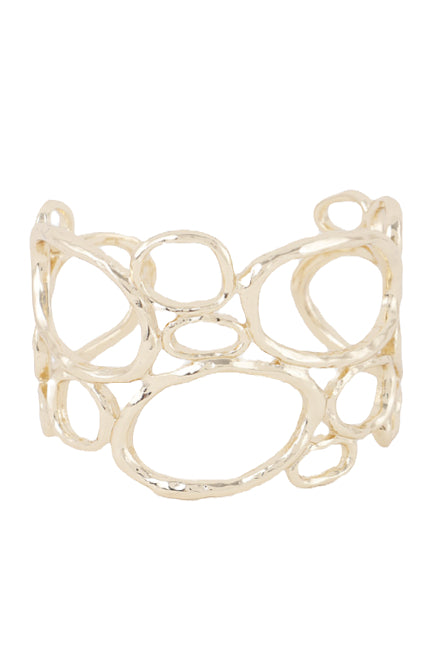 Experience a unique blend of shine and texture with our Hammered Wire Cuff, featuring multi-shaped cutouts and a hammered wire design. Add a touch of intrigue to any outfit with this one-of-a-kind piece.