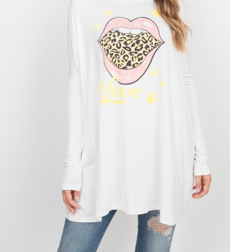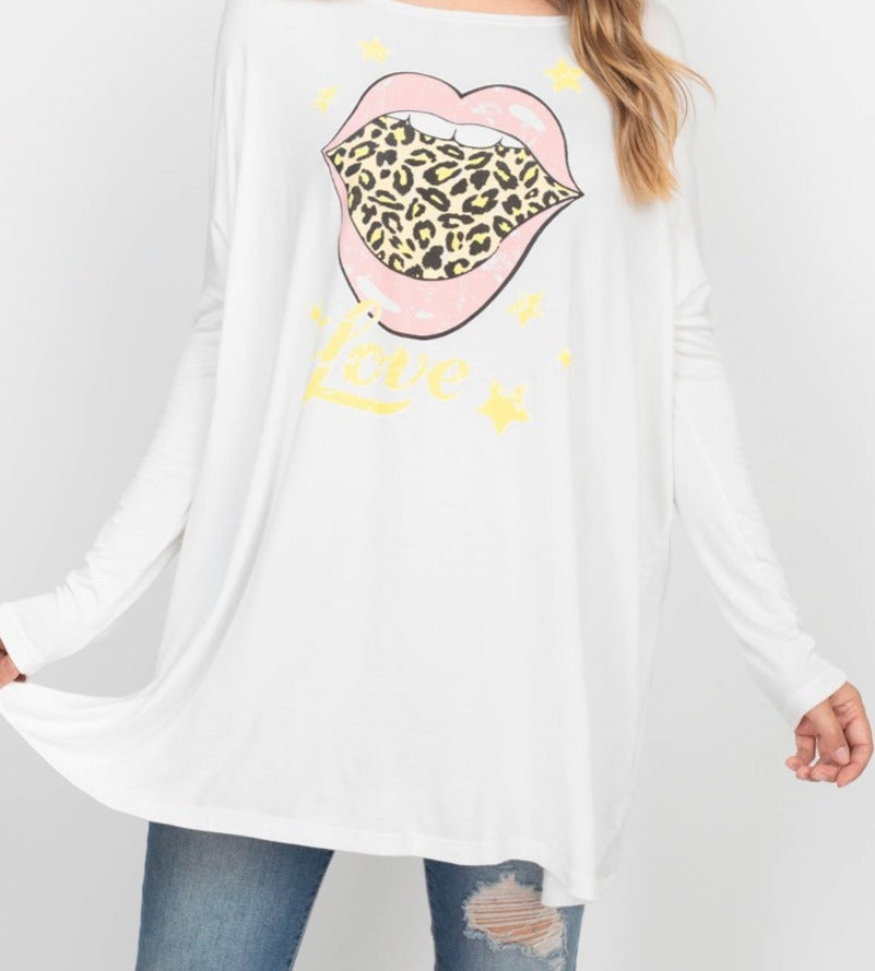 This chic I LOVE You Top features a long dolman sleeve and a flattering scoop neck. The eye-catching mouth open leopard print and love graphics add a playful touch to this tunic top. Stay stylish and express your love with this top.