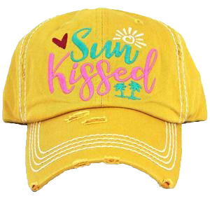 Embrace your chic side with our Sun Kissed distressed cap. Featuring an embroidered design and an adjustable velcro strap, this cap exudes effortless style while also providing a perfect fit. Stay fashion-forward with Sun Kissed.