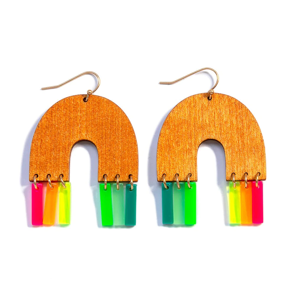 Add a touch of playful charm with our Wooden Arch Drop Earrings. Featuring colorful neon resin tassels, these 2.25" long earrings will make a statement in any outfit. Embrace the quirky side of fashion with these unique and fun accessories!